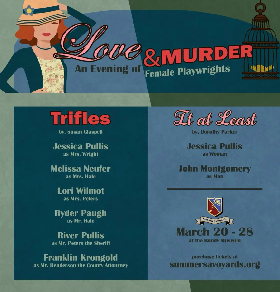 A double feature of one-act plays by legendary female playwrights. Experience the chilling suspense of Susan Glaspell’s mystery "Trifles" followed by the biting, witty humor of Dorothy Parker’s "It at Least." It’s a night of high stakes and sharp satire you won’t want to miss!